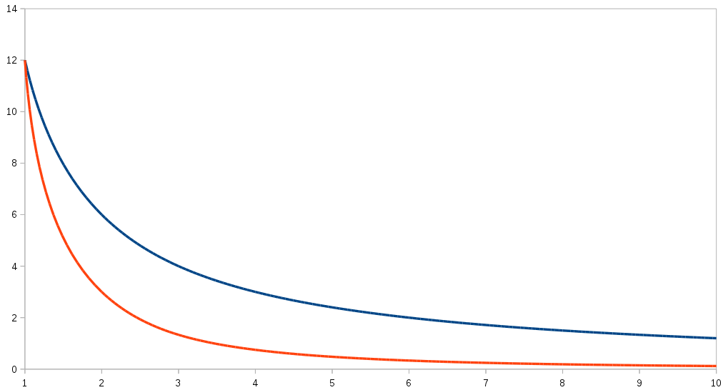 What the Bullion developers have is an inverse function (shown in the graph in blue). As distance increases the attractiveness of the reward drops away. They might be right, I’ve not tested this with their AI (obviously).